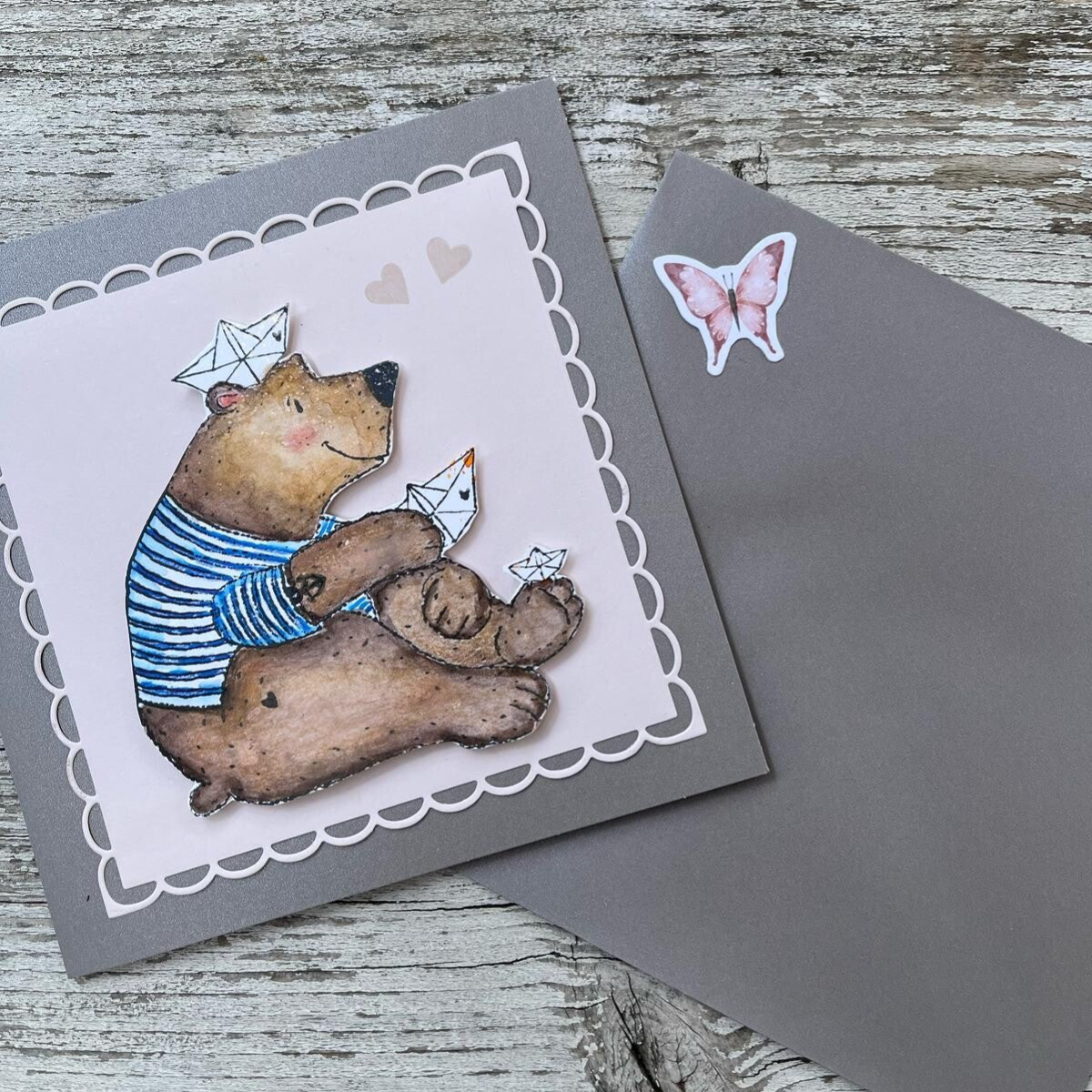 Diese handgemachte Karte ist mit viel Liebe gestaltet und eignet sich perfekt für Geburtstage, Dankeschöns oder maritime Grüsse mit einem Augenzwinkern. Der niedliche Bär mit Seemannsmütze sorgt garantiert für ein Lächeln.